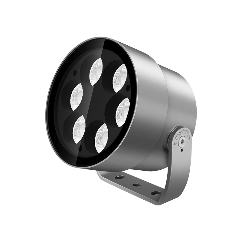 LED floodlights/spotlights for outdoor architectural façade lighting, surface mounted with adjustable bracket. High lumen output up to 100 lm/W. Available with ultra narrow beam 3° light distribution. DMX-RDM, DALI, 0-10V, Tunable White on request.